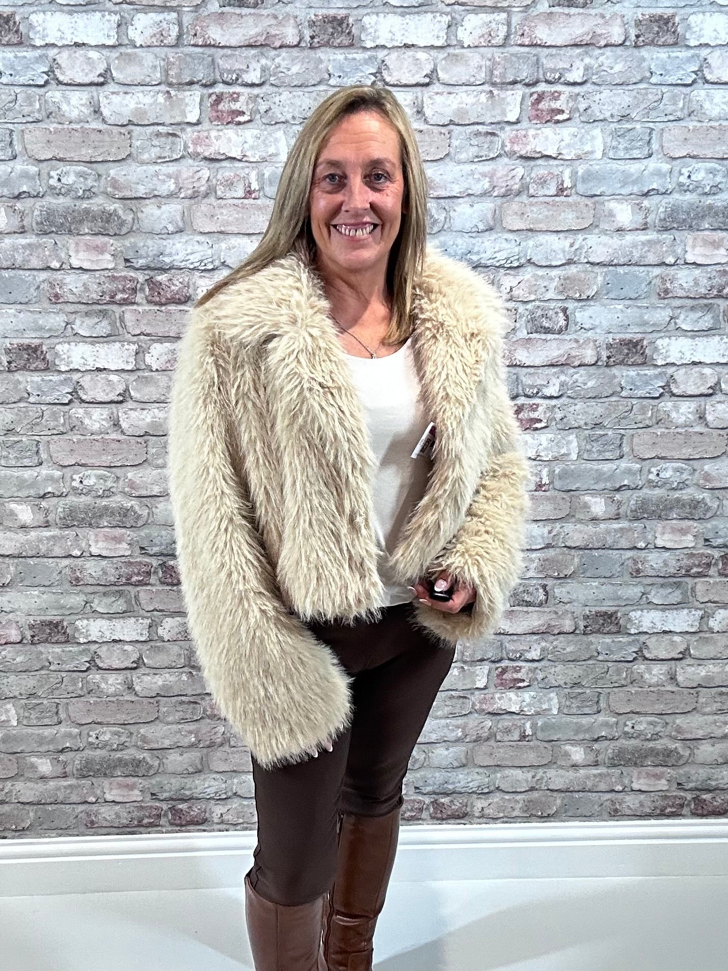 Elevate your look with the Felix jacket—a short faux fur masterpiece featuring a sleek collar, subtle lining, and handy pockets. Its hook and eye fastening adds an edgy touch, making this jacket the stunning statement piece your wardrobe demands.