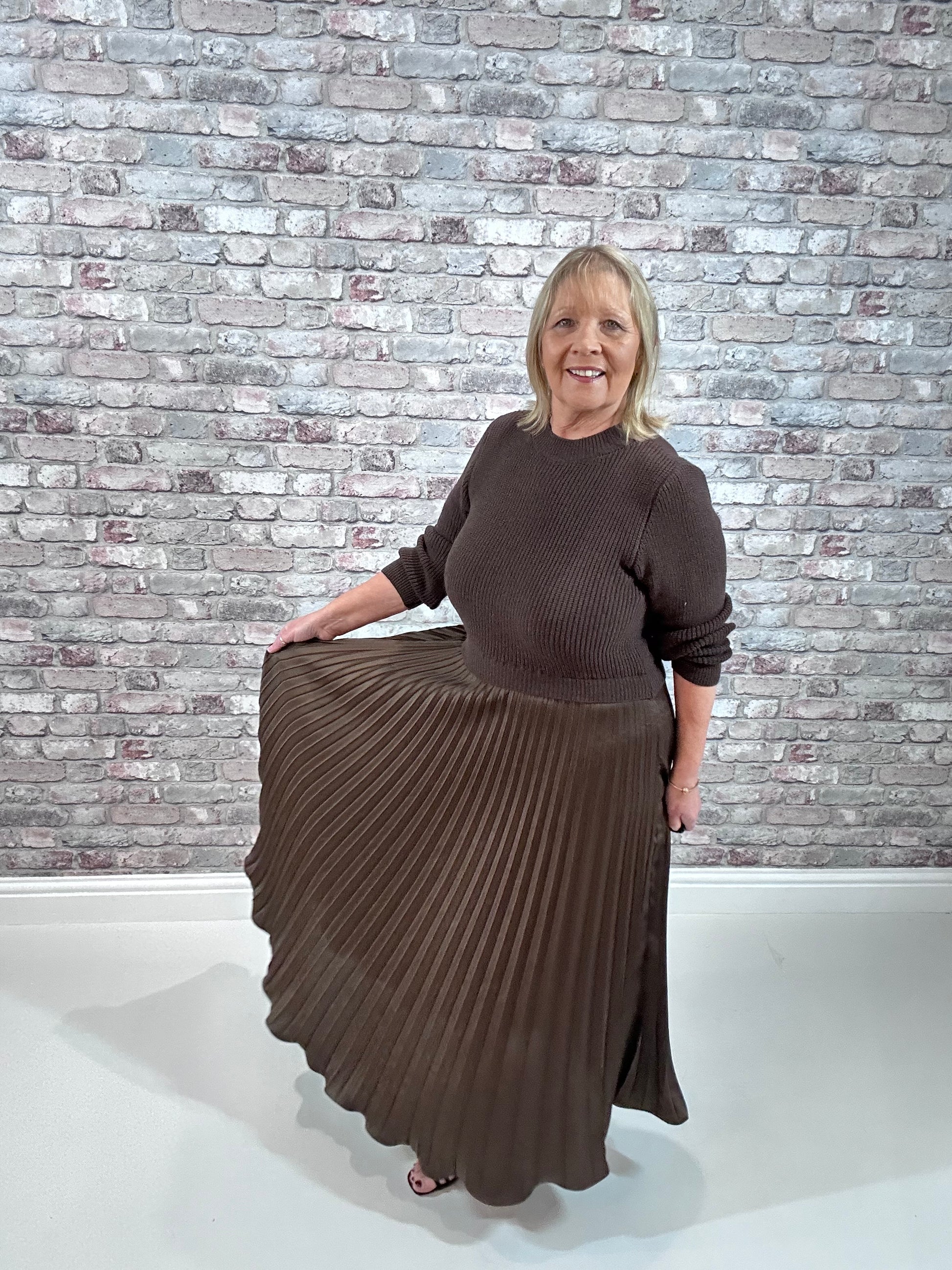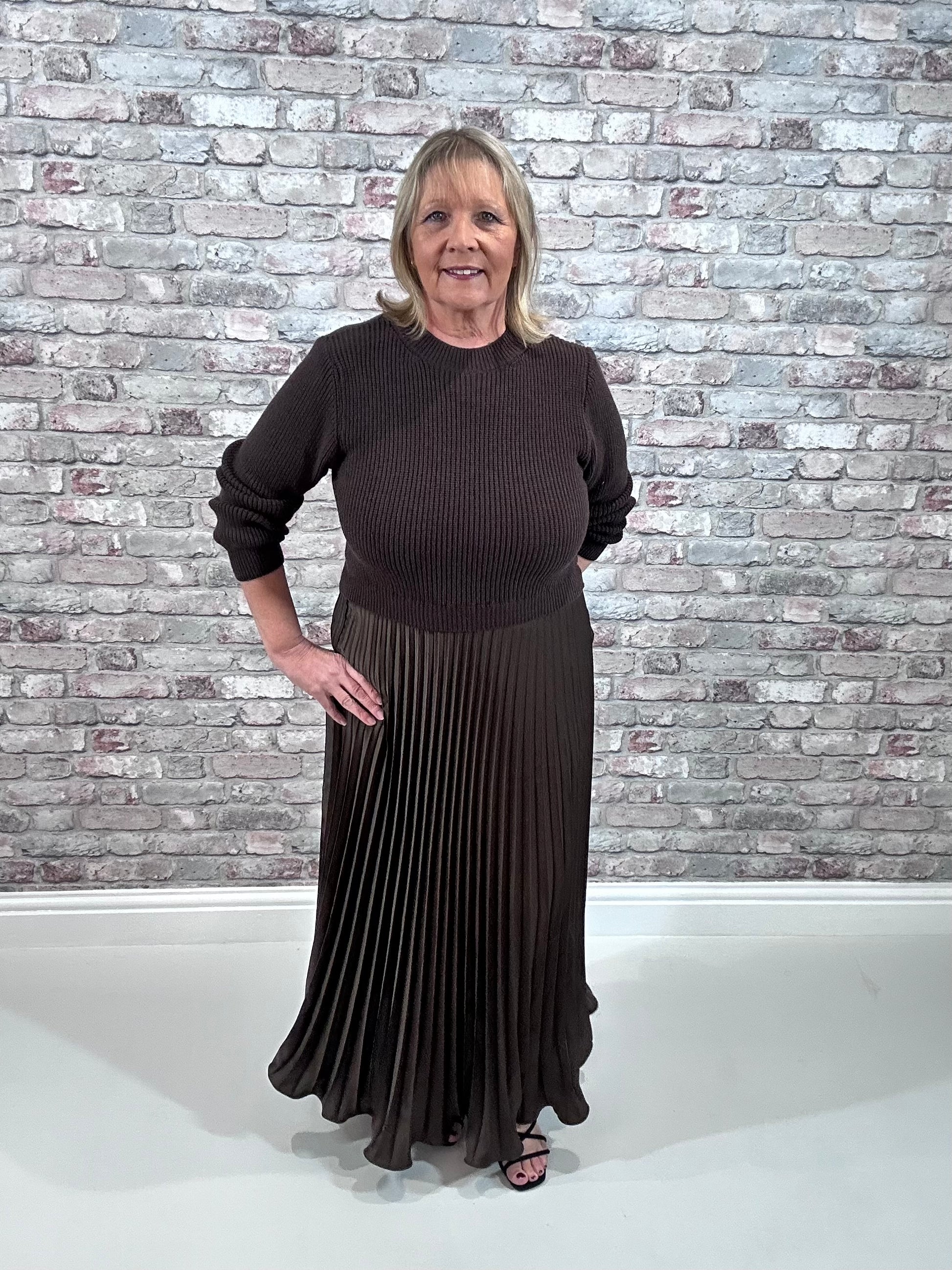 The Katie Dress commands attention with its bold two-piece design. A knitted top featuring a classic round neck and long sleeves pairs seamlessly with a luxurious satin-feel pleated skirt that flows to maxi length, creating an effortlessly sophisticated silhouette. The contrasting textures—cosy knit against fluid satin—deliver unexpected edge and undeniable elegance. Choose from four striking colour options to match your fearless aesthetic. Perfect for those who refuse to play it safe.