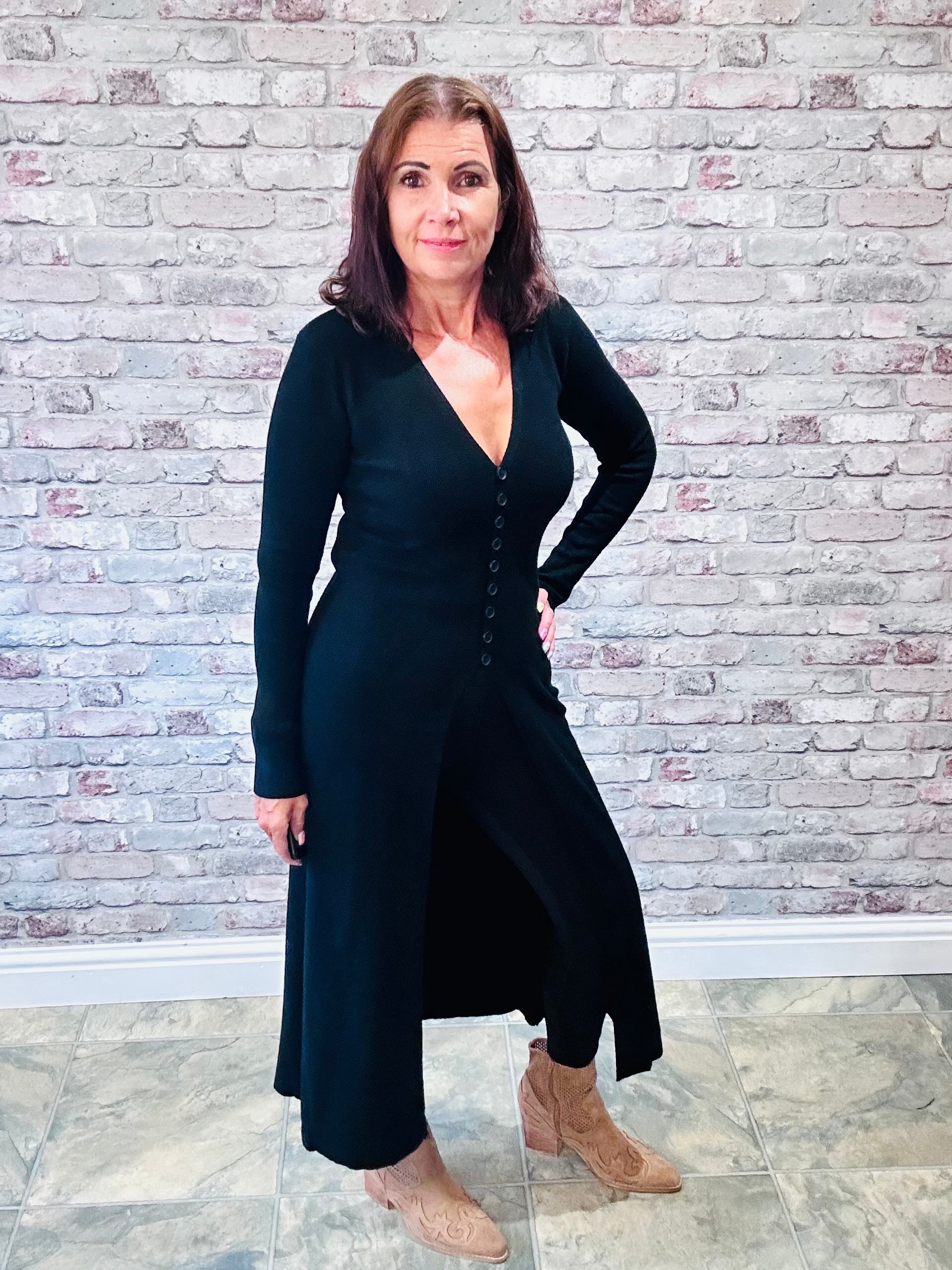 The Roxanne Cardigan redefines bold comfort with its longline, ribbed knit design and deep V-neck. Featuring long sleeves and button fastenings, this statement piece hugs you with a super soft, stretchy fabric that moves with confidence. Perfect for those who dare to stand out while staying cozy.